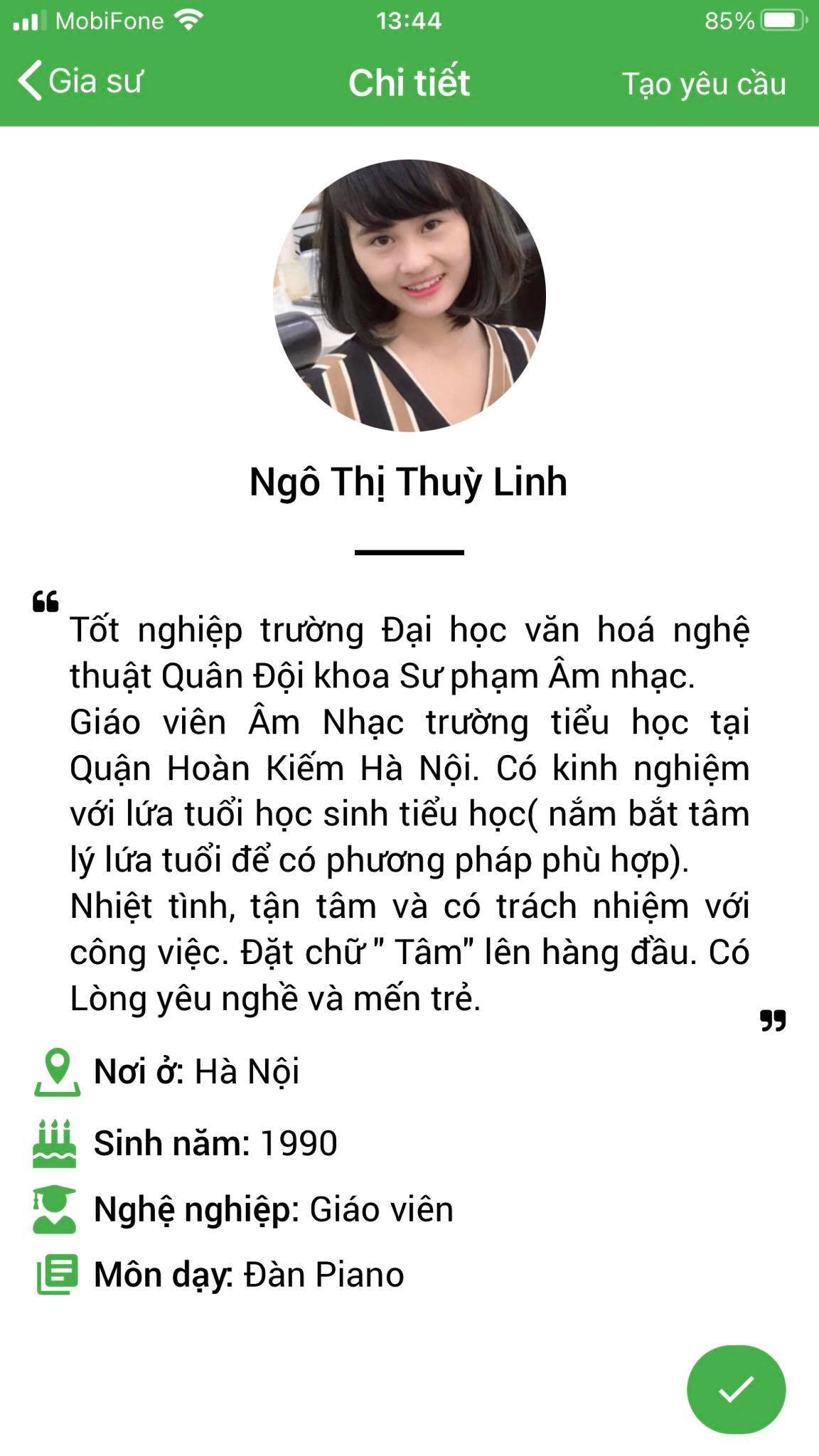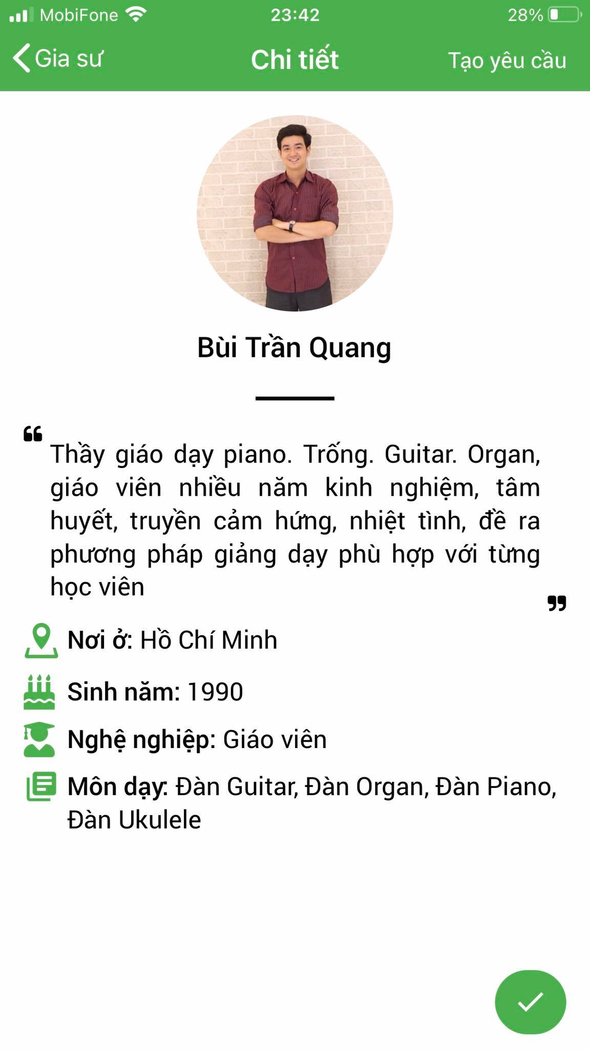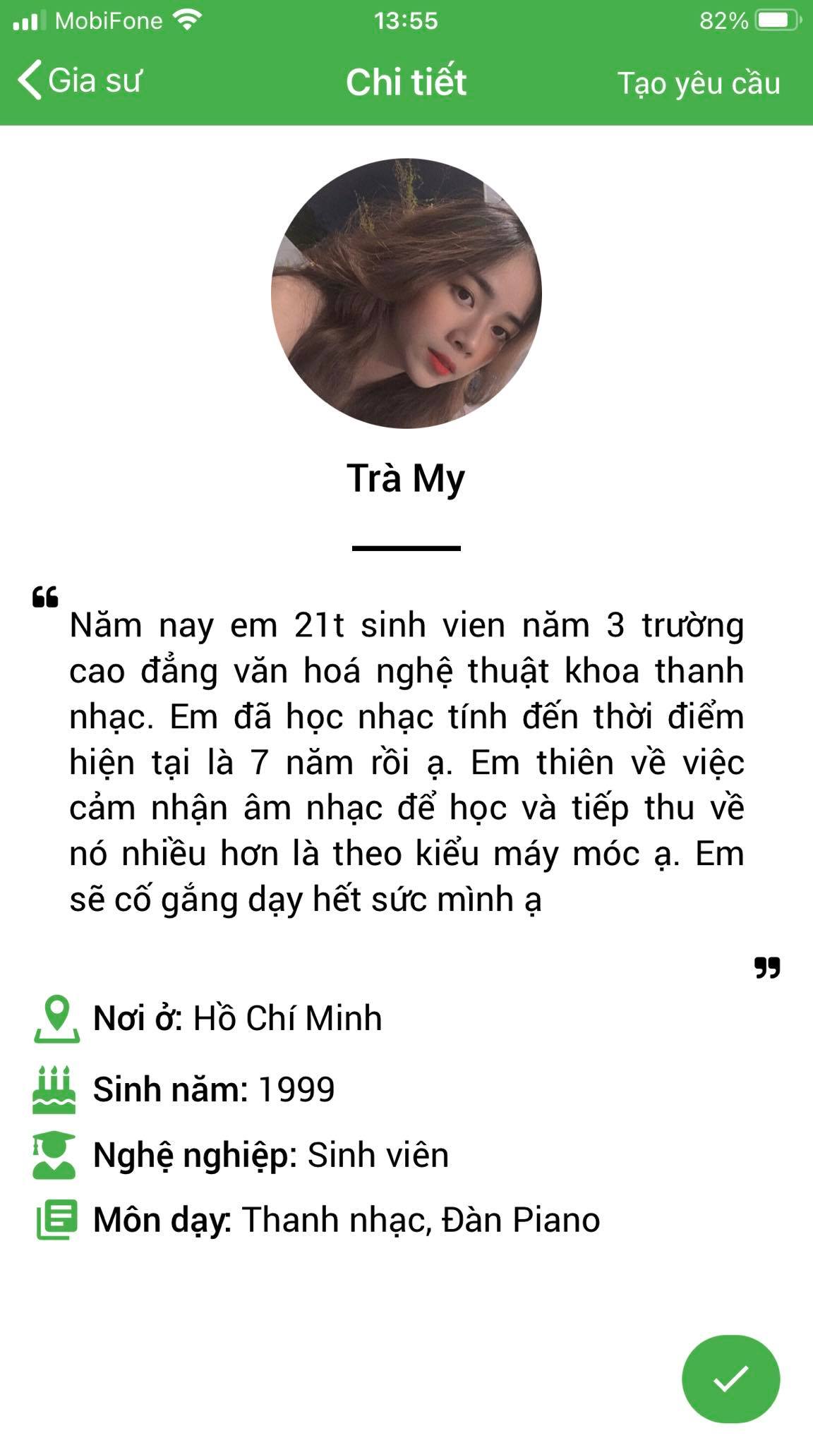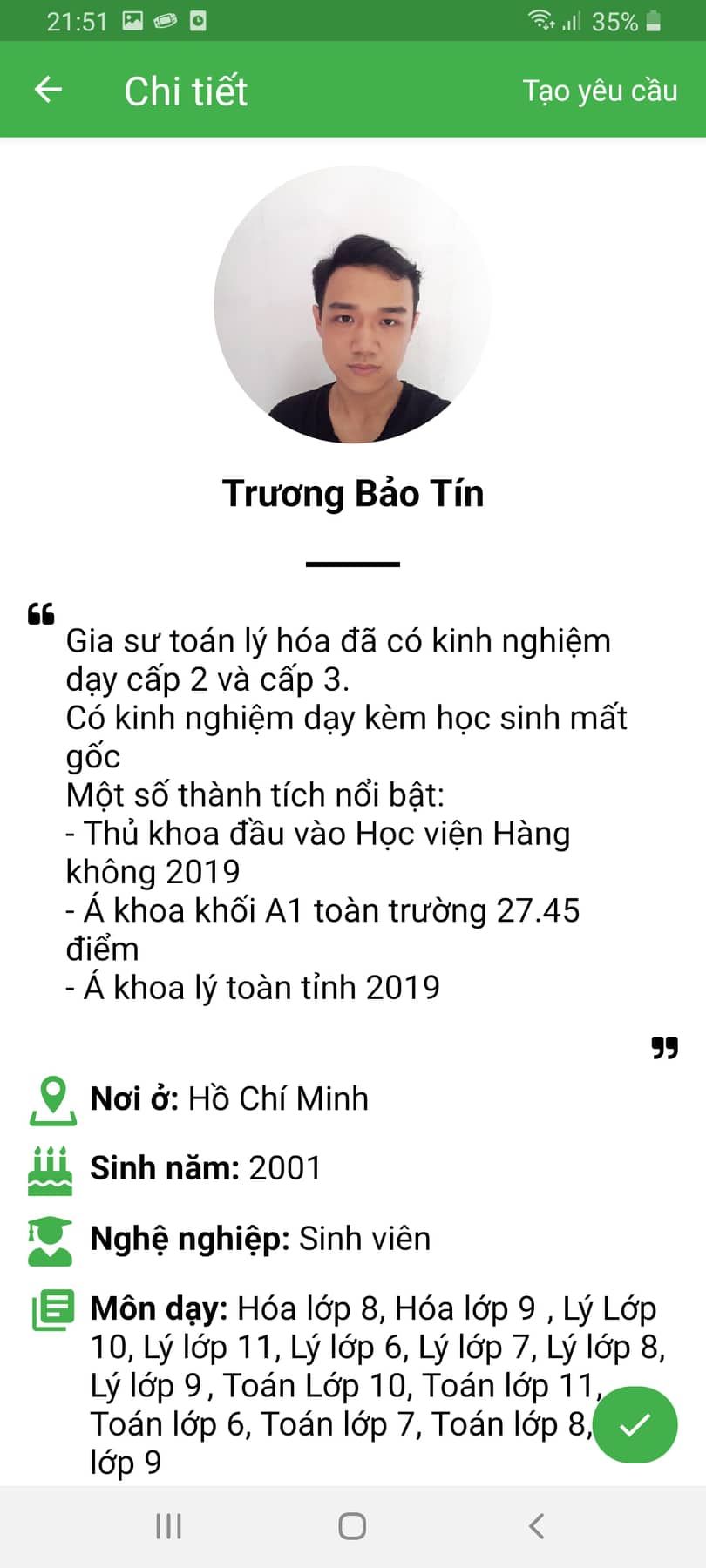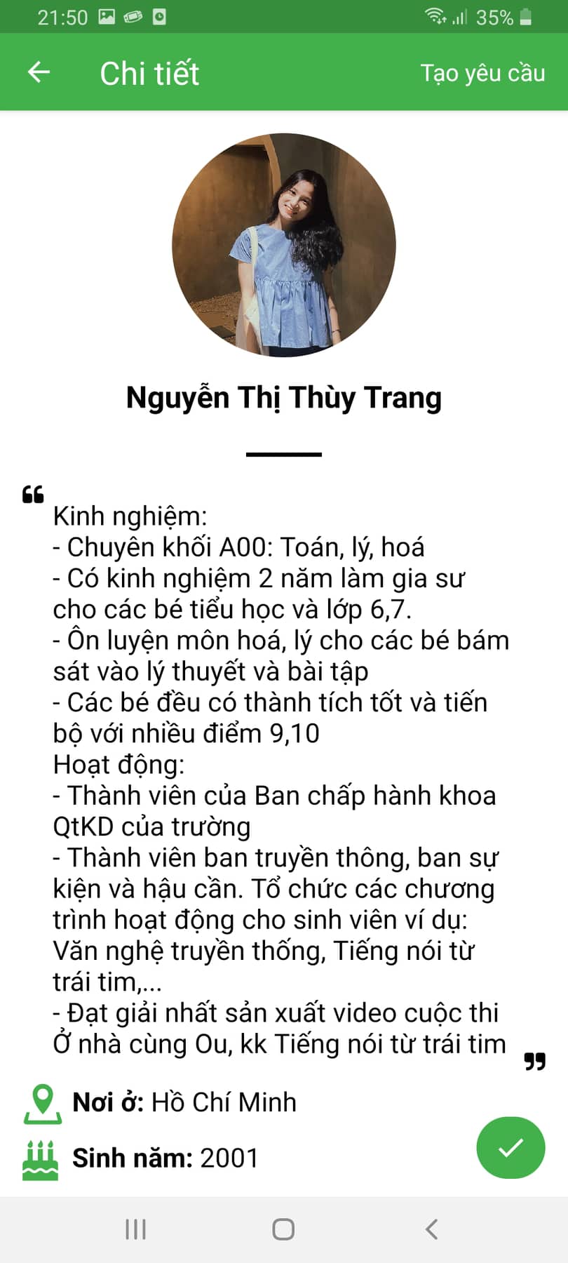 Bằng những thao tác đơn giản và thuận tiện, các học viên sẽ tìm cho mình gia sư phù hợp bằng nhiều tiêu chí khác nhau, dễ dàng tra cứu thông tin gia sư và nội dung lớp học; đồng thời có thể gửi yêu cầu học thử 02 buổi với gia sư mà mình chọn, nếu không phù hợp thì học viên sẽ được tư vấn kỹ hơn và tiếp tục chọn gia sư đến khi nào phù hợp mới thôi.